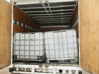 Una camioneta Ford, color gris, placas de circulación SM27841 del Estado de Puebla, con reporte de robo, en el interior se localizan 3 contenedores de plástico de 1000 litros de capacidad aproximadamente al 90% de la misma y 1 contenedor totalmente vacío.